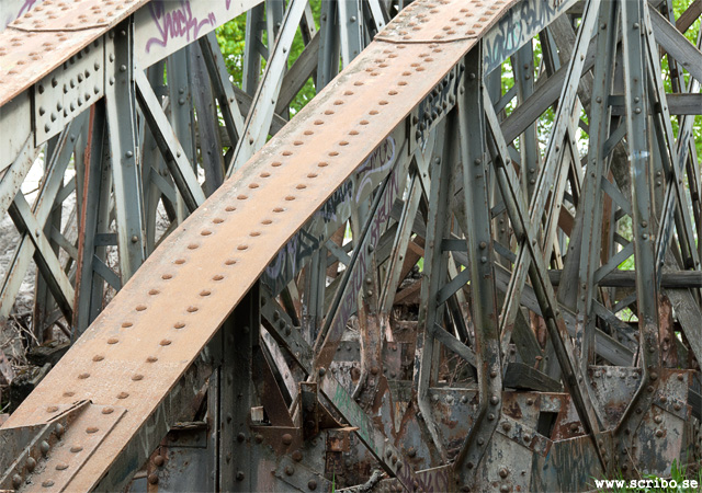 Om ni nu undrar hur den gamla bron såg ut så går det faktiskt fortfarande att titta på den. De kapade bågarna ligger av någon outgrundlig anledning undanskuffade nere vid Kungsänsbron. Jag vet inte om man väntar på att den skall vittra bort men det är inte mycket kvar av färgen. Apropå färgen, bron verkar vara grå och det röda finns bara kvar på de delar som låg under vägbanan. Jag har dessutom sett ett par gamla handkolorerade vykort där bron är målad i vitt. Hur är det nu, har den alltid varit röd? Ytterligare ett mysterium att undersöka.