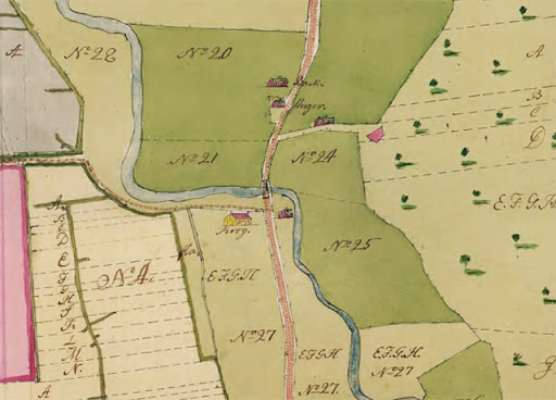 Idag bildar ån en lite sjö just här vilket har fått dagens vägbyggare att flytta vägen åt öster istället för att räta ut den. Jag noterar även att jag borde försöka knåpa ihop ett inlägg om den pampiga stenbron i Högsta.