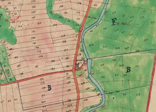 Böjen på vägen strax öster om Lövsta. Karta från 1866.