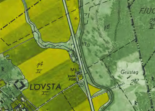 Den första låg strax öster om den gamla byn Lövsta. Här gjorde ån en sväng som tvingade ut vägen åt väster. Numera är ån flyttad och vägen rak. Det verkar ha skett relativt sent för böjen fanns kvar 1890 men är borta på den ekonomiska kartan från 1950-talet.
